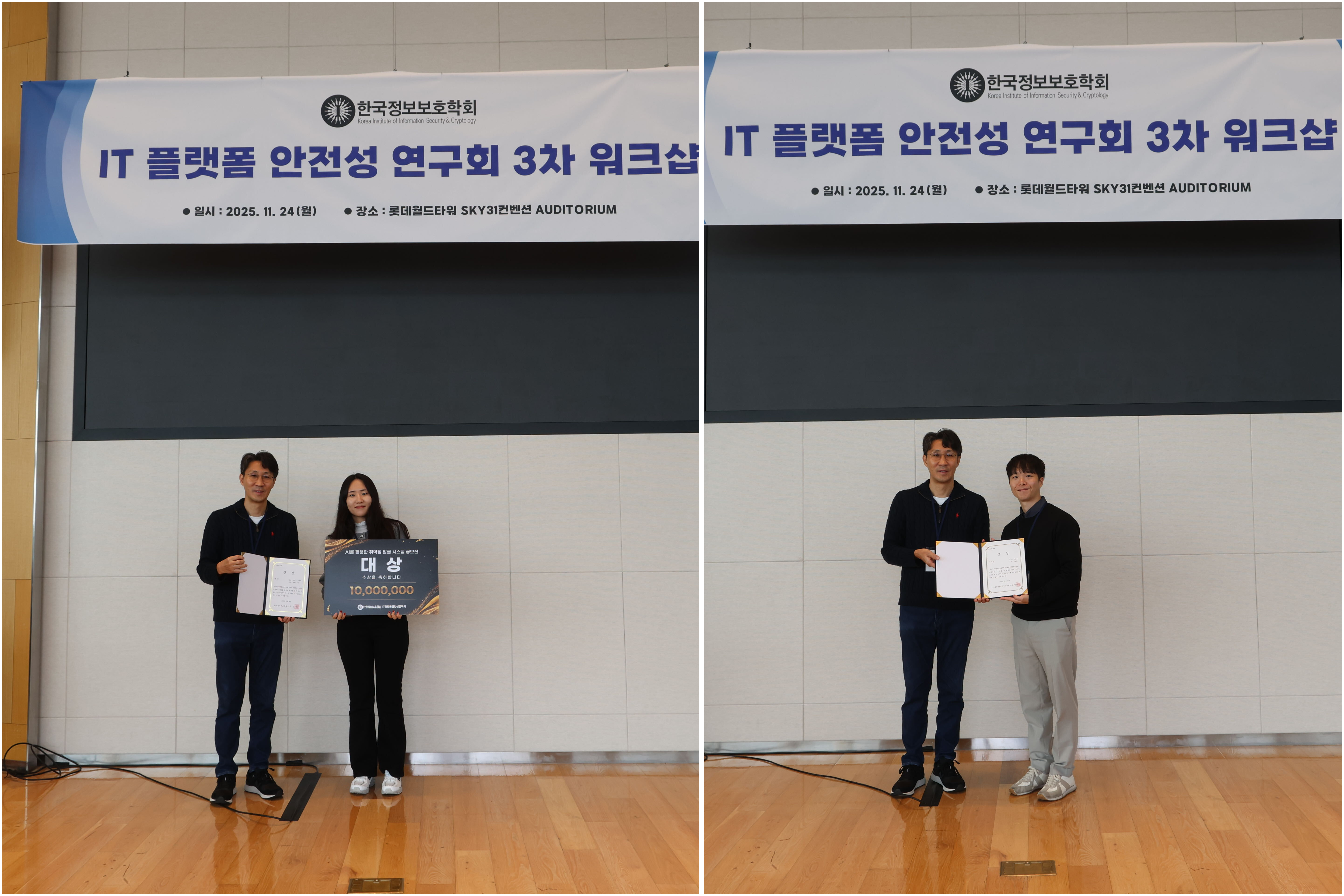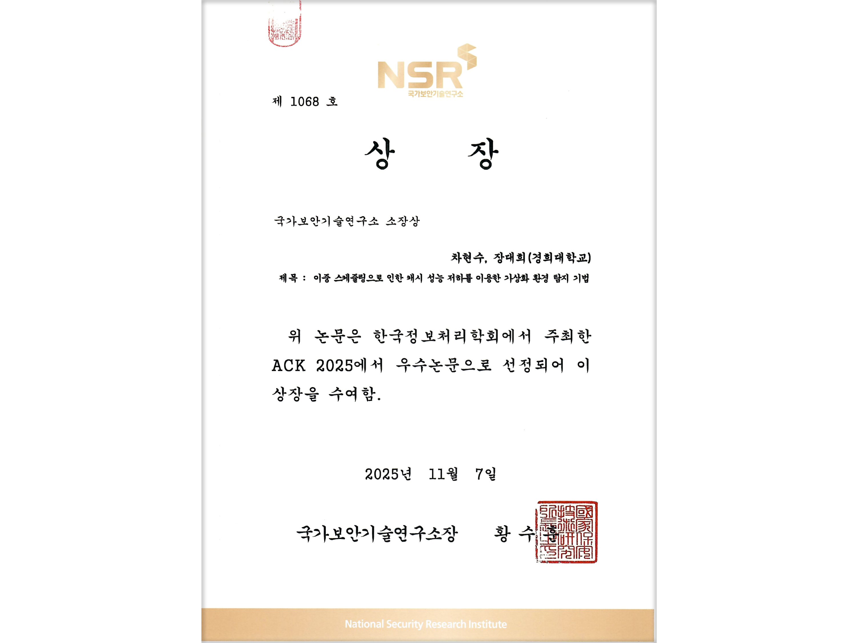 Gallery CyKor CTF 2025 해킹대회 5위 (경희대미남해커들 팀) IT플랫폼안전성연구회 참석 및 행사운영 정보보호학회 AI공모전 대상우수상 수상 (김민서, 김민수 석사과정) 차현수 석사과정, ACK 2025 우수논문상 수상 CODEBLUE 보안 컨퍼런스 참석 및 운영 (김민서 석사과정, 윤석찬 학부인턴) 2025 DEFCON Bahrain 일본 보안기업과 AeroSpace 부스 공동운영 2025 DEFCON Bahrain 컨퍼런스 (임우협 박사과정, 오경제 석사과정) (주)Contac 텍사스 저궤도 인공위성기지국 견학체험방문 2025 삼성MX 기술교류회 참석 2025 경희대 대동제 연구실 친목 활동 국정원/국보연 주관 CCE 2025 해킹대회 본선진출 (경희대미남해커들 팀) 김민서 석사과정, AI보안논문 우수상 수상 PWNLAB 학생들의 연구실 활동 (IT플랫폼안전성연구회 운영, 드론해킹시연) 연구실 세미나 및 친목회식 미국 라스베가스 연구실 단체 관광 2025 DEFCON 연수 및 일본 보안기업과 AeroSpace 부스 공동운영 2025 상용 인공위성 지상국 견학 청와대 청년 화이트해커 행사 (임우협 박사과정) 제1회 드론해킹대회 우승 (차현수 석사과정) 드림핵 CTF 개인전 본선진출 (임우협 박사과정) 2024 미국 BlackHat 해외연수 LG U+ 해킹대회 우수상 (오경제 석사과정) ISITSU CTF 국제 해킹대회 우승 (임우협 박사과정) 최현진 석사과정 2025 Pwn2Own 수상 (Windows 11 LPE 종목) 2025 봄맞이 벚꽃 나들이 AutoHack 2024 입상 (오경제, 황선혁 연구원) 2024 국제드론해킹대회 (PWNLAB 문제개발 및 대회운영) Hack the Drone 2024 컨퍼런스 (테르텐/경희대 공동운영) 2024 세종핵테온 CTF 입상 (정민우 연구원) 2024 우주안보학회 워크숍 2024 PWN2OWN 행사 (태인규 석사과정) 2024 코드게이트 CTF 경희대미남해커팀 활동 2024 DEFCON CTF 예선활동 (PWNLAB 연구원 3명 본선진출) 2023 청와대. 대통령과 청년 화이트해커와의 대화 행사 2023 국가보안기술연구소 김덕진 박사님 세미나 2023 테르텐-PWNLAB 협의체 체결식 2023 LG전자 세미나