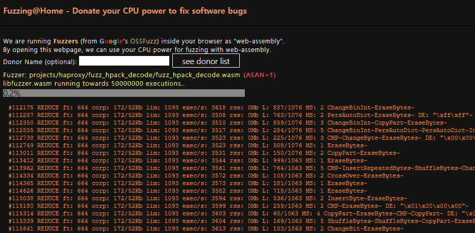 메모리 버그 기반의 보안 취약점들은 Fuzzing 이라는 방법으로 탐색을 자동화 할 수 있으며 이와 관련해서 수많은 연구들이 수행되고 있습니다. Fuzzing@Home 은 저희 연구실에서 개발한 시스템으로 비신뢰 이기종 단말로 구성된 분산 컴퓨팅 네트워크에서 효율적으로 수행할 수 있는 인프라를 구축한 연구입니다. 아래의 그림은 Fuzzing@Home 시스템의 일부분으로, Google 의 libfuzzer 를 Web Assembly 바이너리로 포팅하여 웹 브라우저 엔진 내부에서 실행시킬 수 있도록 한 것을 나타냅니다.