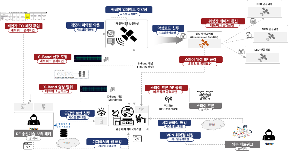 인공위성 시스템은 그림과 같이 지상국과의 교신 및 장거리 RF 통신등의 특수한 요소들을 포함하고 있으며 이러한 요소들에서 기존에 생각하기 어려웠던 사이버보안 및 해킹의 위협들이 등장하고 있습니다. 우리 연구실에서는 오픈소스 위성 지상국 구축부터 인공위성 탑제채 펌웨어의 역공학 및 위성 RF 통신 등 다양한 저궤도위성 운용에 관한 기술들에 대해서 해커/공격자적 관점의 연구를 수행합니다.